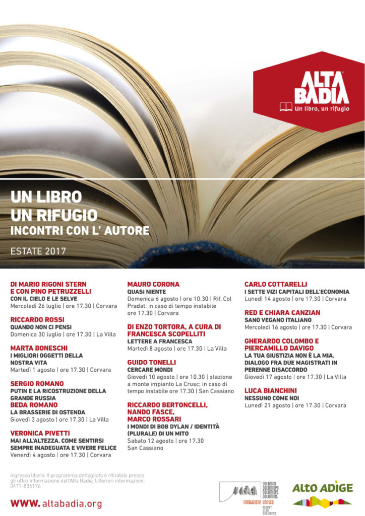 “Un libro, un rifugio” compie quest’estate quattordici anni di incontri, pensieri, parole e musiche”, dice Gianna Schelotto, la curatrice della rassegna. “In tutto questo tempo, grazie alla magia dell’Alta Badia è stato possibile assistere al miracolo della lettura, trasformata da esperienza intima e privata in manifestazione unanime e corale.” “Ma leggere continua ad essere una straordinaria esperienza individuale”, dice ancora Schelotto. Un libro, un rifugio… appunto!”
