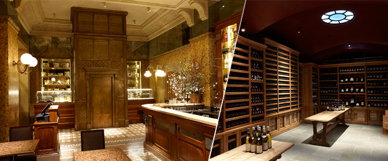 50 coperti al piano terra (dehors incluso), 50 al primo piano, fino a 100 posti seduti e 150 in piedi al secondo sono racchiusi in un luogo inedito, firmato dallo Studio Peregalli per esprimere una legacy architettonica che spazia dalla seconda metà dell’800 a Gio Ponti, per concretizzare un’idea di stile milanese sobrio, raffinato e leggero. Al piano terra, al Cafè impreziosito dal grande bancone-bar della fine dell’800, la proposta gastronomica è più semplice rispetto al Ristorante, con piatti meno elaborati, per pranzi e cene veloci e informali. Qui è previsto uno spazio dedicato alla pasticceria e alle creazioni in cioccolato del pastry chef Marco Pedron. La cucina del Ristorante, che si trova al primo piano ed è articolato in tre sale e due privé, sarà all’insegna della continuità con quella del ristorante in via Victor Hugo: non mancheranno i piatti classici, dall’insalata russa caramellata al tuorlo d’uovo marinato, dal risotto allo zafferano e midollo, alla piastra al rombo in crosta di cacao. Una carta a parte, con piatti come ostriche, spaghetti al caviale, viene invece proposta per chi sceglie di fermarsi nello scenografico Fumoir: bancone in mogano e zinco, bottiglieria con specchio ed elementi di gusto Art Deco. Il secondo piano, dove si accede dal cortile di via Silvio Pellico, è riservato alle occasioni speciali: concepito come uno scenario teatrale, permette di creare ogni volta un ambiente su misura, intorno al grande bancone del bar in marmo di Levanto degli anni ’20. Da non perdere una visita alla cantina, che ospita oltre 2000 etichette e oltre diecimila bottiglie, con un’importante selezione di vini soprattutto italiani.