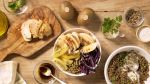 Ingredienti per 4 persone: 400 di lenticchie verdi cotte (oppure in barattolo, scolate), 2 kiwi Zespri SunGold, 1 mela, 100 g di cavolo rosso, 400 g di petto di pollo, 30 g di semi di girasole, 3 mazzetti di coriandolo fresco, 2 rametti di menta, 2 rametti di prezzemolo.