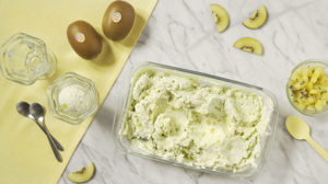 Ingredienti per 6 persone: 3 kiwi Zespri SunGold, 3 avocado maturi, 200 ml di panna fresca, 2 cucchiai di sciroppo d’agave, 2 cucchiai di miele, 300 ml di yogurt magro al naturale, Succo di 1/2 limone, Qualche goccia di estratto di vaniglia, Qualche fogliolina di menta fresca (facoltativo).