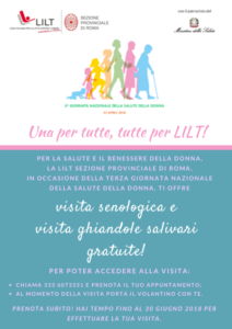 Per il terzo anno consecutivo la sezione provinciale di Roma della LILT (Lega Italiana per la Lotta contro i Tumori) partecipa alla Giornata Nazionale per la salute della Donna, il 22 aprile, con la campagna di prevenzione “Una per tutte, tutte per LILT!” (#unapertuttetutteperLILT). Sabato 21 aprile 2018, i medici volontari dell’Associazione offriranno uno screening ecografico gratuito di seno e ghiandole salivari, nello stand LILT allestito per l’iniziativa dal ministero della Salute in viale Giorgio Ribotta 5, dalle ore 09.30 alle 17.00. Le donne interessate potranno scaricare dal sito legatumoriroma.it il volantino da presentare allo stand. Sempre nella stessa giornata sarà possibile parlare della propria alimentazione e del rapporto con il cibo nei colloqui “one to one” con la nutrizionista volontaria della LILT di Roma. La prevenzione primaria dei disturbi del comportamento alimentare parte dall’incontro delle donne da parte degli specialisti del settore: anche solo affrontare il problema, riconoscendolo, si può compiere un grande passo avanti. In Italia si è abbassata l’età di esordio dei disturbi, che incidono tra lo 0,2 e lo 0,8% nelle ragazze fra i 12 e i 15 anni, per quanto riguarda la anoressia nervosa, e il 3% delle ragazze per la bulimia nervosa. «Dopo il successo dei primi due anni, la LILT di Roma torna al Ministero della Salute per consentire un controllo gratuito del seno e delle ghiandole salivari alle donne che non lo hanno mai fatto o non hanno avuto tempo per farlo. Il tumore che colpisce la mammella come sappiamo ha l’incidenza in assoluto maggiore nella popolazione femminile (sono 50mila i nuovi casi solo nel 2017), ma presenta anche i migliori successi in termini di prevenzione e diagnosi precoce. Negli ultimi 8 anni il tasso di sopravvivenza infatti è aumentato del 26%. Raro è invece il cancro delle ghiandole salivari, con un’incidenza intorno allo 0,2 – 1 %. Ma non bisogna abbassare la guardia», raccomanda il dottor Roberto Morello, presidente della LILT di Roma.