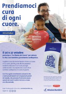 Si stima che ogni anno nel mondo nascano 1 milione di bambini affetti da malformazioni congenite al cuore. Di questi circa l’80% vive in un Paese povero. Se nei Paesi più avanzati le patologie vengono diagnosticate in fase prenatale e operate alla nascita, così non accade dove mancano medici specializzati e ospedali adeguatamente attrezzati. In questi Paesi la metà dei bambini cardiopatici è destinata a non raggiungere il primo anno di vita, mentre chi sopravvive manifesta gravi problemi di crescita e di sviluppo psicosomatico. Per questi bambini l’unica speranza è rappresentata dalla solidarietà internazionale. Dal 2005 Fondazione Mission Bambini interviene salvando i piccoli malati di cuore in Asia, Africa ed est Europa. Porta dove è necessario personale medico e infermieristico volontario altamente specializzato in modo che possa curare i bambini sul posto e formare il personale locale oppure, quando nel paese di origine mancano le strutture, porta in Italia (o in Romania, se nati in est Europa) i bambini malati. Sostiene gli ospedali locali attraverso l’acquisto di attrezzature mediche e, quando necessario, copre i costi delle operazioni per le famiglie più povere. In oltre 14 anni Mission Bambini ha salvato 2.066 bambini cardiopatici attraverso operazioni di cardiochirurgia pediatrica, ha garantito visite e una diagnosi corretta ad oltre 16.000 bambini, ha coinvolto oltre 400 medici locali in attività di formazione gratuita. Attualmente la Fondazione è attiva con interventi di cura delle cardiopatie infantili in 7 Paesi: Cambogia, Eritrea, Myanmar, Romania, Uganda, Zambia e Zimbabwe. Per seguire il progetto di Mission Bambini per la cura delle cardiopatie infantili all’estero: #GivetheBeat.