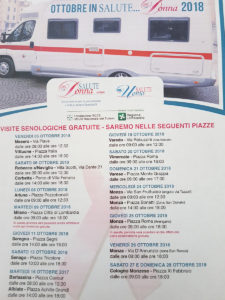 Dal 5 al 28 ottobre il Camper di “Salute Donna Onlus” farà tappa in diverse città lombarde, con il debutto anche della piazza di Varese. Le altre località coinvolte saranno: Mesero e Vittuone (5 ottobre); Robecco sul Naviglio e Corbetta (6 ottobre); Arluno (8 ottobre); Milano, piazza Città di Lombardia (9 ottobre); Seregno (11 ottobre); Senago (13 ottobre); Barlassina e Albiate (16 ottobre); Varedo (18 ottobre); Vimercate (20 ottobre); Varese (21 ottobre); Monza (24-25-26 ottobre); Cologno Monzese (27-28 ottobre)