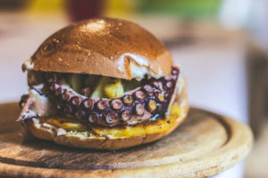 Ingredienti per 4 persone: 1 polpo da 1 chilo, 1 avocado maturo, 200 g stracciatella, 4 rosette o michette o panini integrali da 100 grammi ognuno, 15 foglie menta, 100 grammi di salicornia, olio extravergine di oliva, sale, pepe.