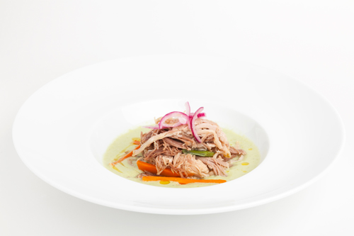 500 g di Soia Edamame, 2 cipollotti di Tropea, 350 g di tonno del Chianti, brodo vegetale, salsa di soia, aceto, olio extravergine d’oliva sale & pepe