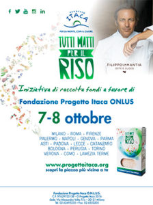 Sarà Filippo La Mantia, cuoco dell’omonimo ristorante, il testimonial dell’iniziativa di raccolta fondi di Fondazione Progetto Itaca Onlus “Tutti matti per il riso” che animerà le principali piazze italiane sabato 7 e domenica 8 ottobre, in occasione della Giornata Mondiale della Salute Mentale indetta dall’OMS (Organizzazione Mondiale della Sanità), per un totale di 16 città italiane (Milano, Roma, Firenze, Palermo, Napoli, Genova, Padova, Lecce, Catanzaro, Parma, Bologna, Perugia, Torino, Verona, Como, Asti) e più di 50 piazze, 300 volontari e 7.000 kg di riso.