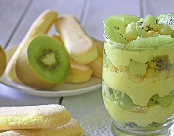 Preparare le dolcezze verdi in un bicchiere multistrato (savoiardi-kiwi-crema-kiwi):