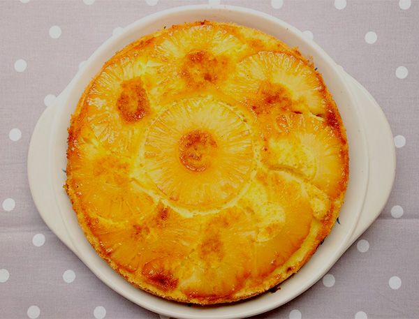 Per la torta: 500 g di ananas a fette (sciroppato), 100 ml di liquido di conservazione dell’ananas, 300 g di farina integrale di tipo “0”, 80 g di zucchero di canna, 2 cucchiaini di bicarbonato, 1 cucchiaio di aceto di mele, 50 ml di olio Evo, 240 ml di latte vegetale (soia, riso o mandorla), cannella, zucchero al velo.
