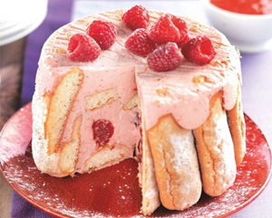 400 g di fragole, 100 g di fragole per la decorazione, 250 g di yogurt intero naturale, 200 g di zucchero a velo vanigliato, 2 dl di panna fresca, 1 dl di succo di mela non zuccherato , 15 g di gelatina in fogli, 12 savoiardi.