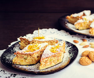 - Mettere sul piatto da portata e, se si amano i liquori, bucherellare la superficie e colare un po’ di liquore all’amaretto, sennò, semplicemente spolverizzare la superficie con zucchero a velo.