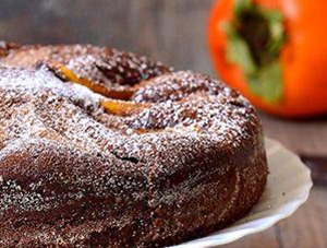 Ingredienti per 4 persone: 3 cachi, 1 cucchiaio abbondante da cucina di cacao amaro, 50 g di fecola di patate, 2 uova, 2/3 cucchiai da cucina di latte intero o parzialmente scremato, 150 g di farina, 1 bustina di lievito per dolci, 80 g di zucchero, 1 cucchiaio da cucina di rhum o di brandy, un pizzico di sale, burro (per stampo). A piacere, zucchero a velo per decorare