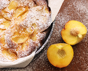 7. Versate il composto nello stampo, posizionate e disponete bene le pesche sopra l’impasto.